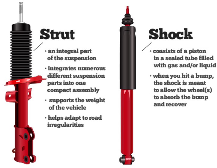 Like shocks, struts are vital parts of a car's suspension system. They even perform some of the same functions, like absorbing shocks and damping vibrations. But shocks and struts are far from the same thing. Strut refers to a combined shock and coil spring unit. In that sense, every strut contains a shock, but struts do a lot more than just absorb bounces. They're also critical structural components, helping to support the vehicle's weight by replacing the upper control arms and ball joints. Struts also help maintain wheel alignment. They usually connect to the steering knuckle via two large bolts. On many vehicles, these bolts serve as adjustment points for the car's front end, making the struts vital components of both the suspension and steering systems.